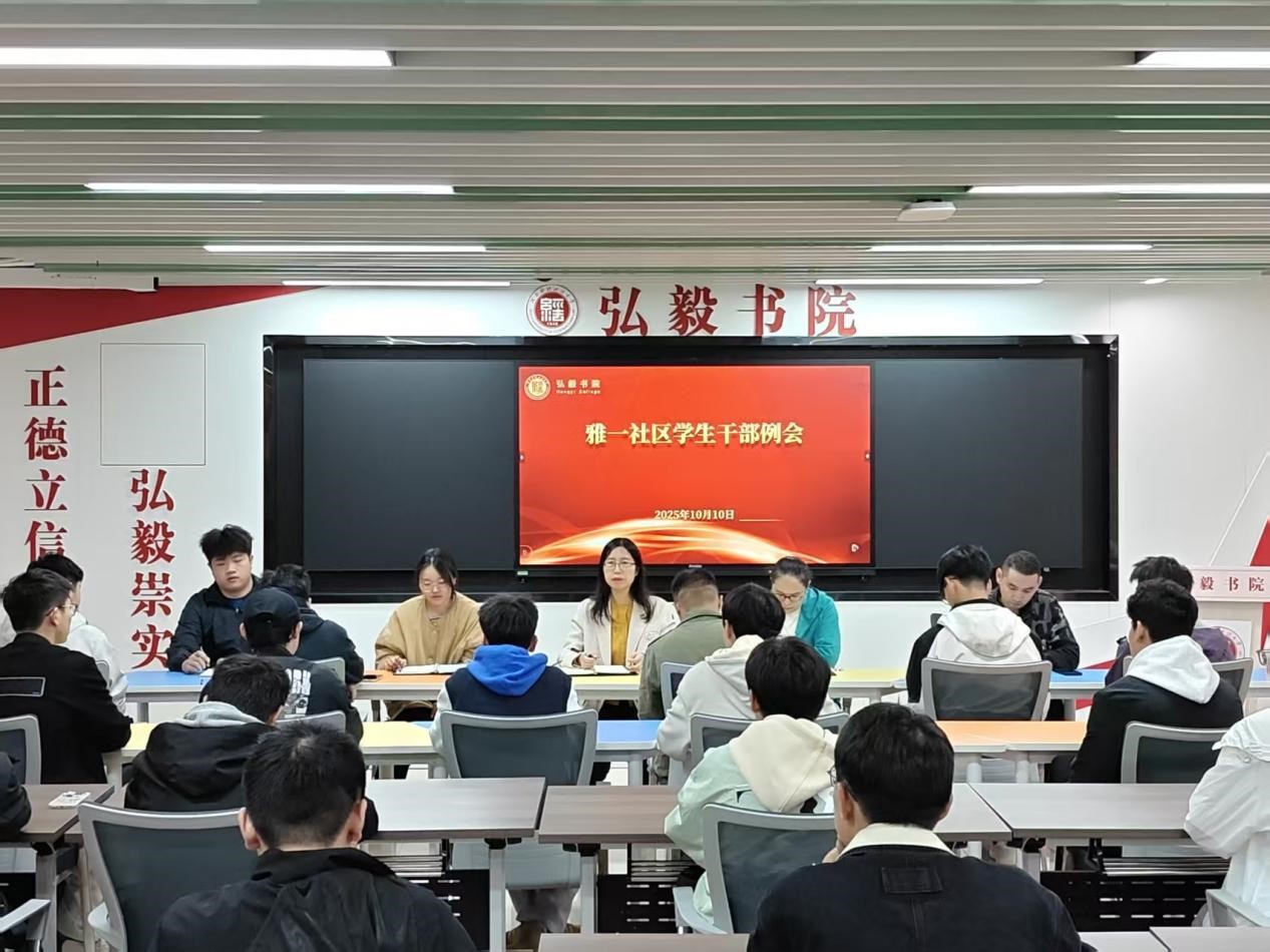 2025 年10月10日,雅一社区学生干部工作例会在弘毅书院二楼召开,弘毅书院党委副书记卫艳涛、社区团委书记汤灿、学生服务中心主任林琳、学生服务中心副主任孙康、兼职辅导员朱家锐出席会议,雅一社区学生干部参会。
