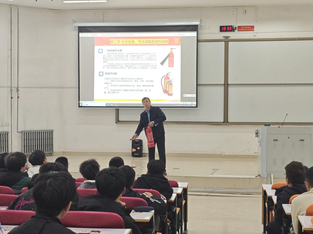 吴庆围绕消防安全主题,进行了系统性的消防安全知识与技能培训。他通过图片、视频等多种形式,清晰地展示了宿舍内可能存在的消防安全隐患,如使用违规电器、堵塞消防通道等,并系统讲解了预防措施以及初起火灾扑救、火场逃生的基本方法。他重点演示了灭火器的正确操作步骤,强调“提、拔、握、压”使用要领,帮助同学们将抽象知识转化为实战技能。