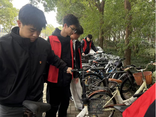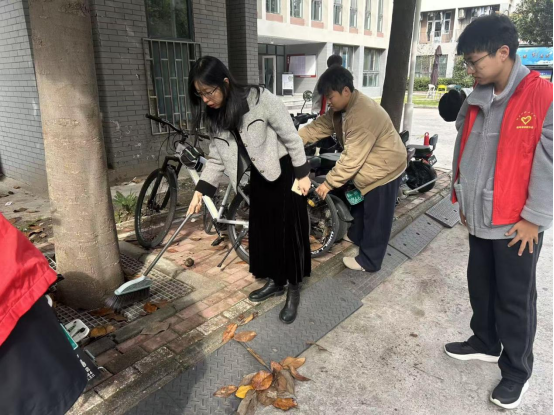 春阳和煦,党徽与志愿者红衣交相辉映。学生党员和志愿者们热情投入,配合默契——在绿化区细心清理纸屑烟头,不放过一个卫生死角;在停车区耐心整理共享单车,恢复整齐秩序。汗水见证付出,笑容洋溢脸庞,卫艳涛与同学们并肩劳动、亲切交流,现场氛围温馨。