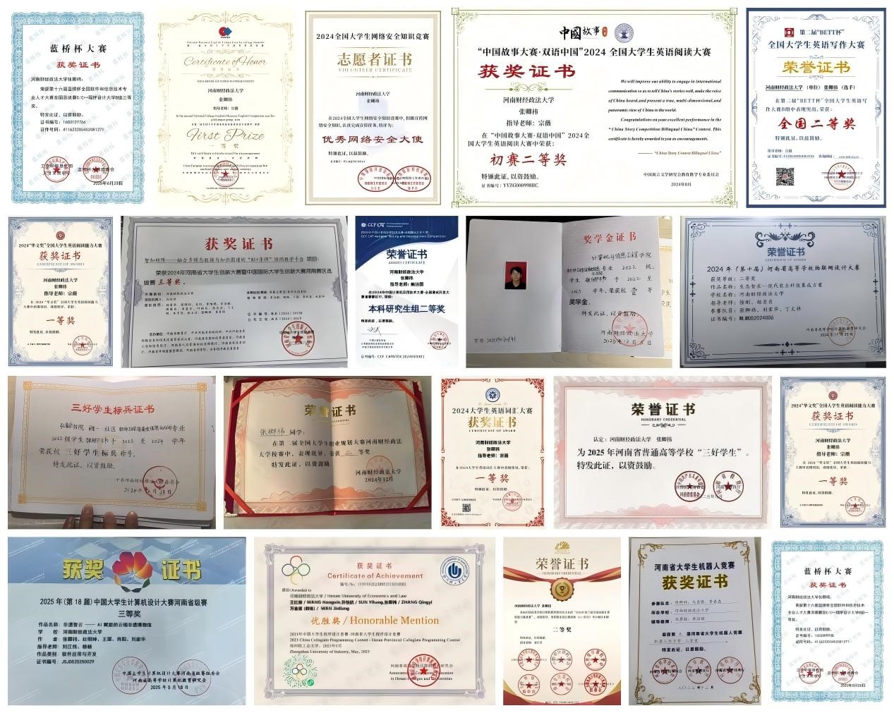 同时,我也在实践中收获成长:作为网络安全大使、竞赛志愿者,参与暑期实习和公益志愿活动,这些经历让我懂得,成长不止于个人进步,更在于责任与担当。“国家奖学金”“河南省三好学生”“校一等奖学金”等荣誉,便是对这段奋斗时光的最好认可。