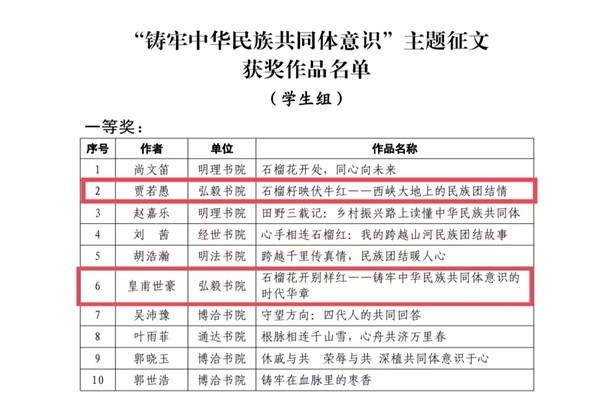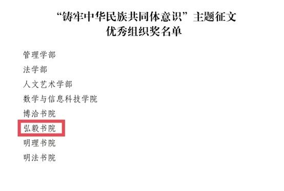 近日,我校举办的“铸牢中华民族共同体意识”主题征文活动结果正式揭晓。在本次征文活动中,弘毅书院精心组织,广泛动员,师生们围绕主题,执笔抒怀,充分展现了书院在思想政治引领和育人方面的显著成效。最终,书院荣获优秀组织奖,我院学生组12人获奖。具体名单如下: