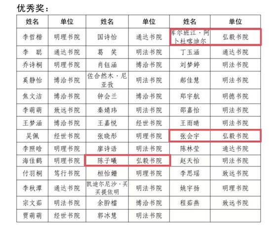 贾若愚、皇甫世豪获得学生组一等奖,阿卜杜艾尼·吐尔洪、鲁人文获得学生组二等奖,贾毅鸣、江宇翔、闫威赫、彭博、李书贤获得学生组三等奖,陈子曦、库尔班江·阿卜杜喀迪尔、张会宇获得学生组优秀奖。