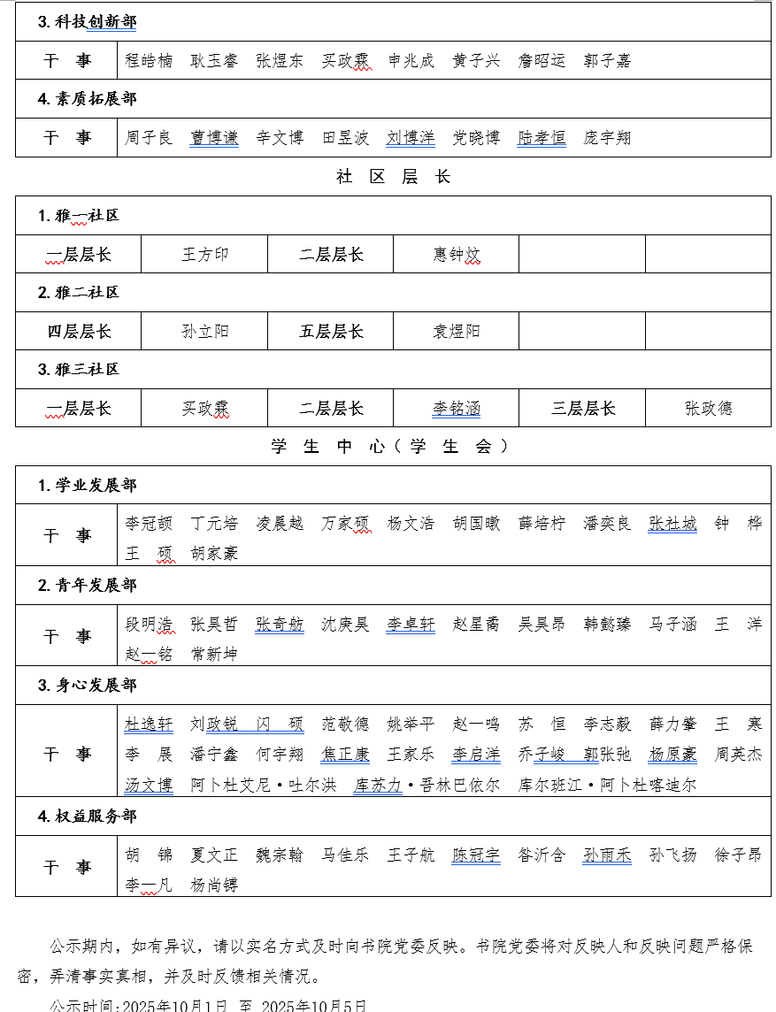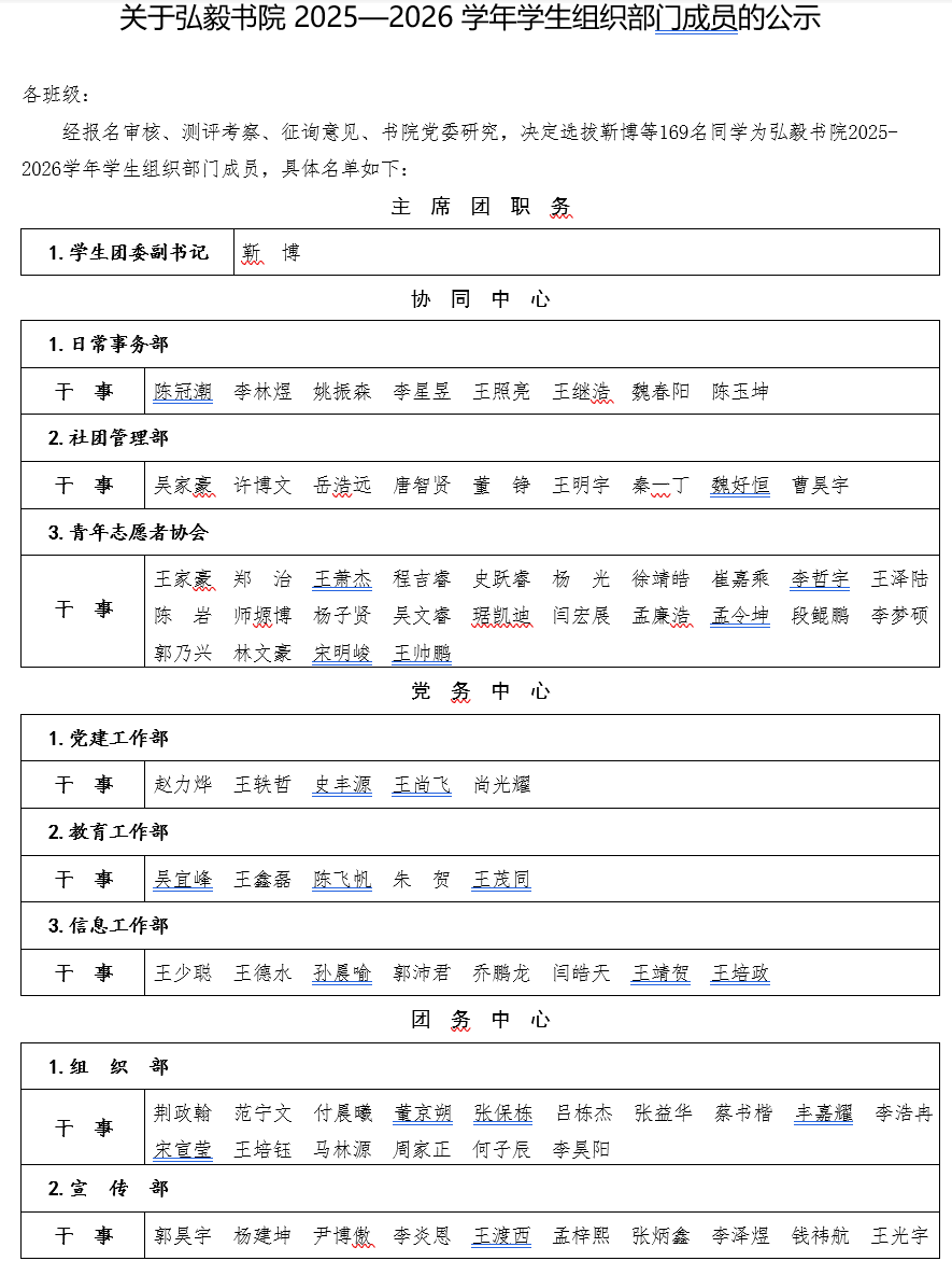 关于弘毅书院 2025—2026 学年学生组织部门成员的公示